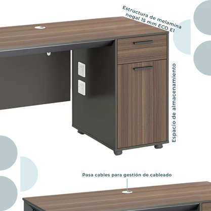 El Escritorio Ejecutivo Cracovia es un ejemplo sobresaliente de cómo el diseño y la funcionalidad pueden fusionarse en una pieza de mobiliario, elevando la estética y eficiencia de cualquier espacio de trabajo moderno. Este escritorio, fabricado a partir de un tablero de partículas de grado ECO E1, no solo simboliza una elección consciente y sostenible, sino que también garantiza durabilidad en el uso diario. Su acabado en melamina importada no solo realza la belleza del escritorio, sino que también proporciona una capa protectora, extendiendo la vida útil del mueble y manteniendo su aspecto impecable.