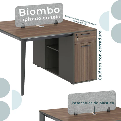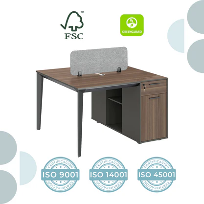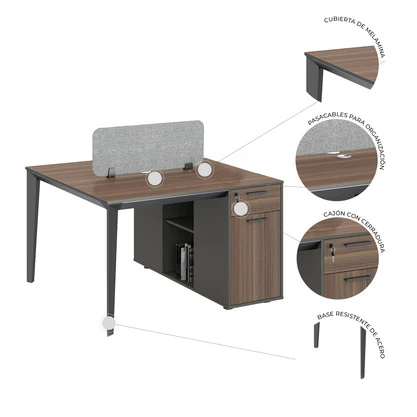 La Estación de Trabajo Cracovia, diseñada específicamente para dos personas, es una solución eficiente y estilizada para oficinas que buscan maximizar la productividad y el trabajo en equipo. Fabricada con un enfoque en la sostenibilidad, la estación utiliza un tablero de partículas de grado ECO E1, lo que demuestra un compromiso con prácticas respetuosas con el medio ambiente. El acabado de melamina importada sobre el tablero no solo garantiza una superficie de trabajo duradera, sino que también aporta un toque de elegancia al diseño general de la estación.