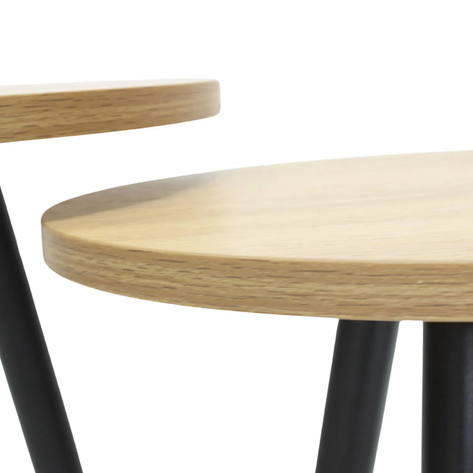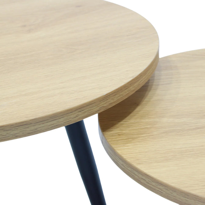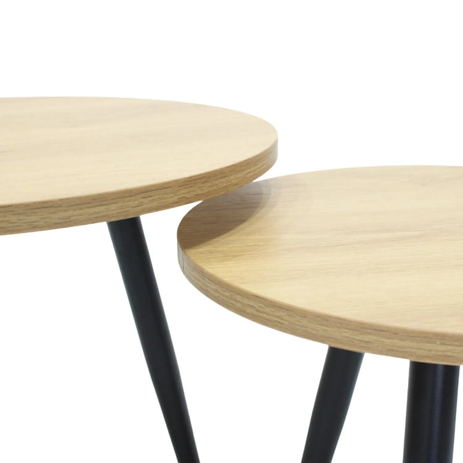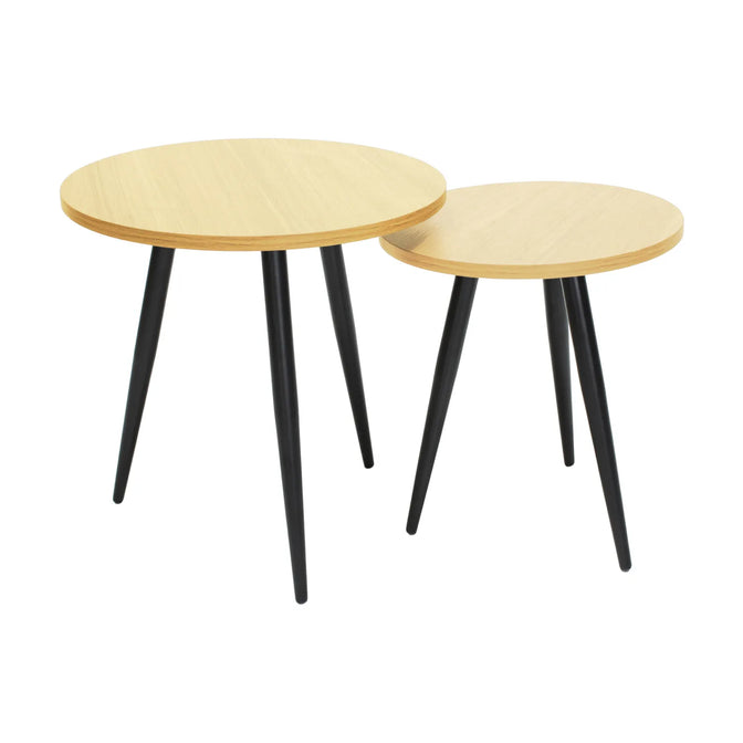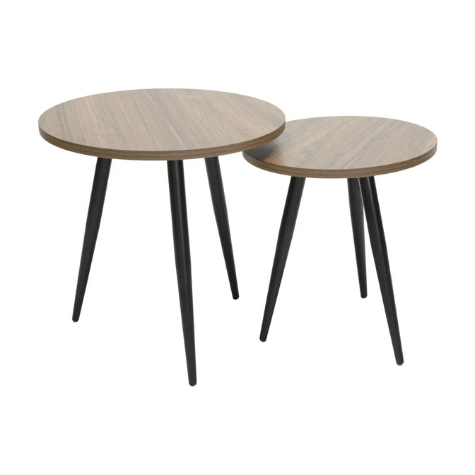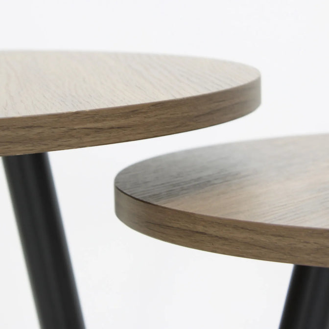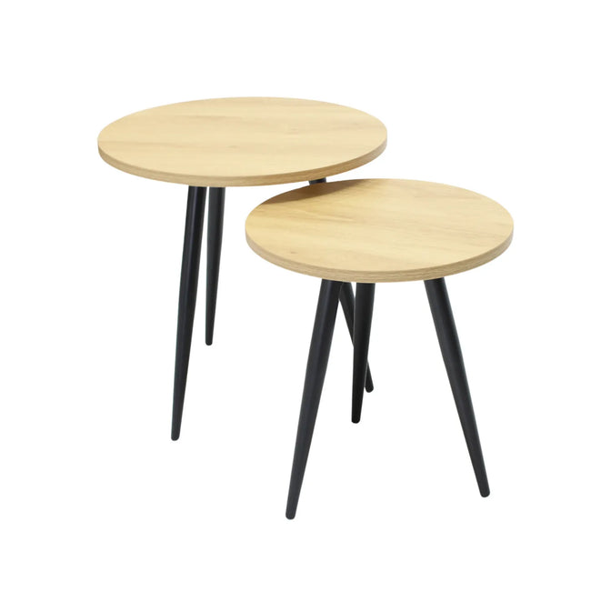 El juego de mesas laterales Batam combina estilo y funcionalidad en un diseño compacto, ideal para cualquier espacio moderno. Este set incluye dos mesas de tamaños diferentes (50x50 cm y 40x45 cm), perfectas para utilizar como mesas auxiliares, de centro o incluso para decorar rincones de tu hogar u oficina. Las superficies de las mesas están fabricadas con MDF de 18 mm de grosor, recubierto con un acabado de melamina Este material no solo aporta un toque cálido y sofisticado, sino que también asegura resistencia al uso diario, siendo fácil de limpiar y mantener.