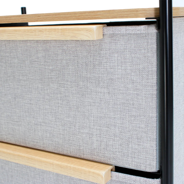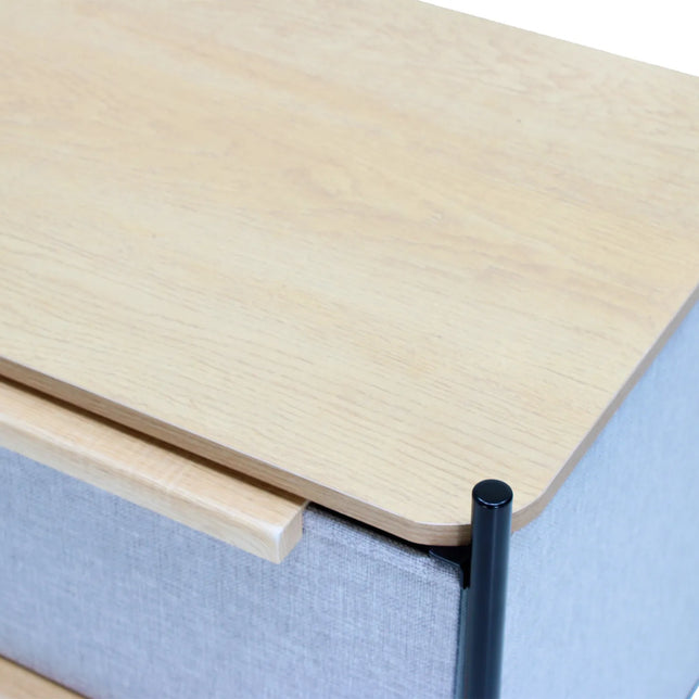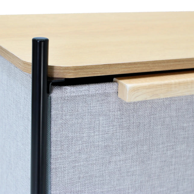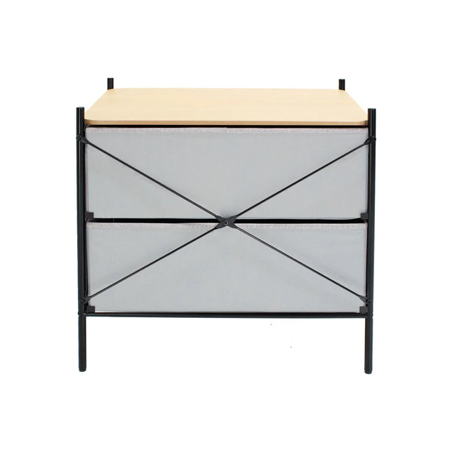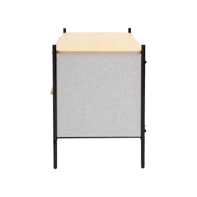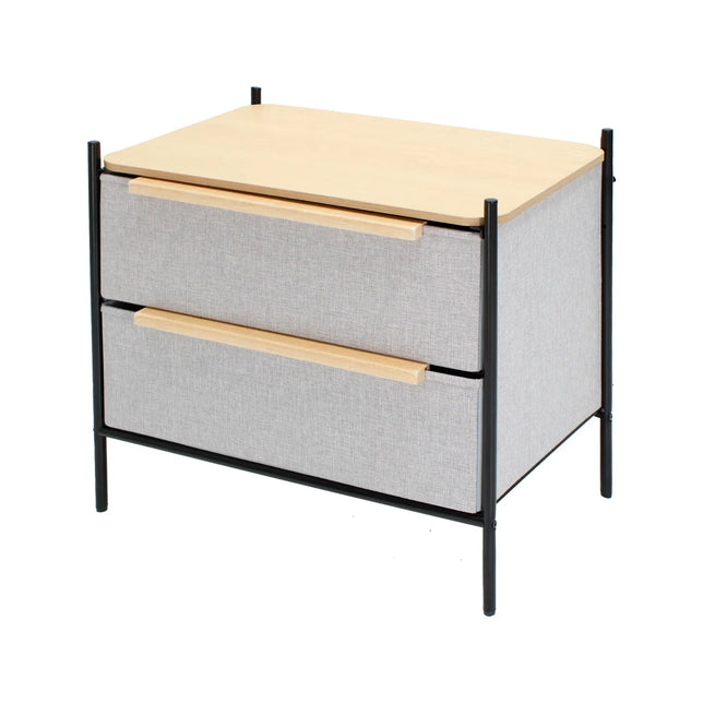 - DISEÑO MODERNO Y FUNCIONAL: El buró Pilsen de MUNDO IN MUEBLES con 2 cajones combina tela imitación lino, MDF y estructura de acero, ideal para cualquier espacio decorativo.
