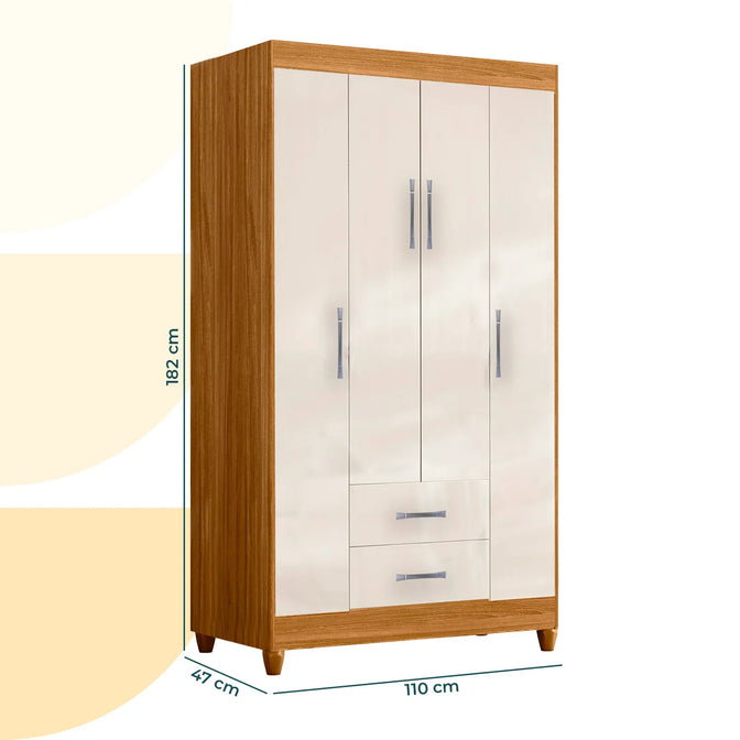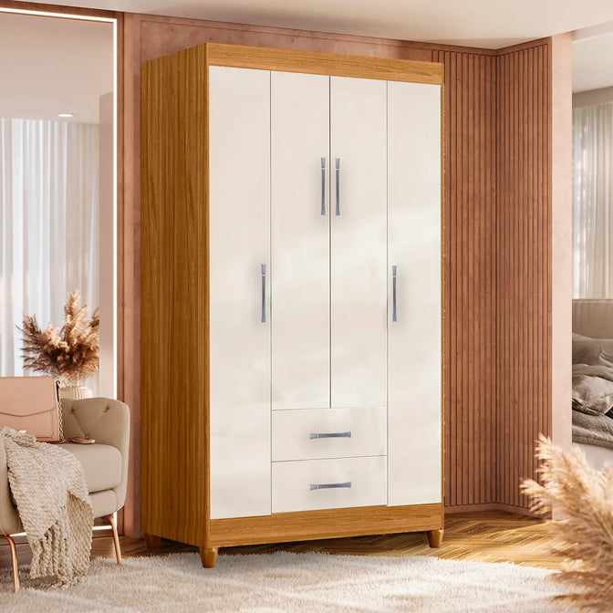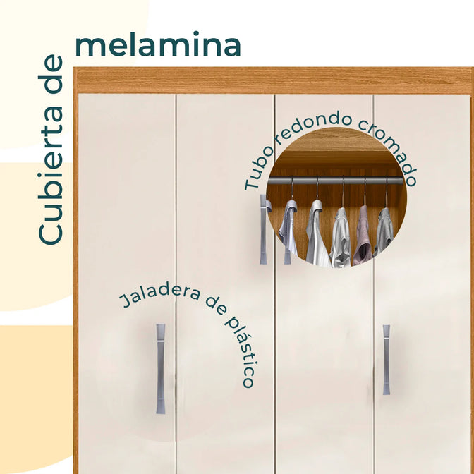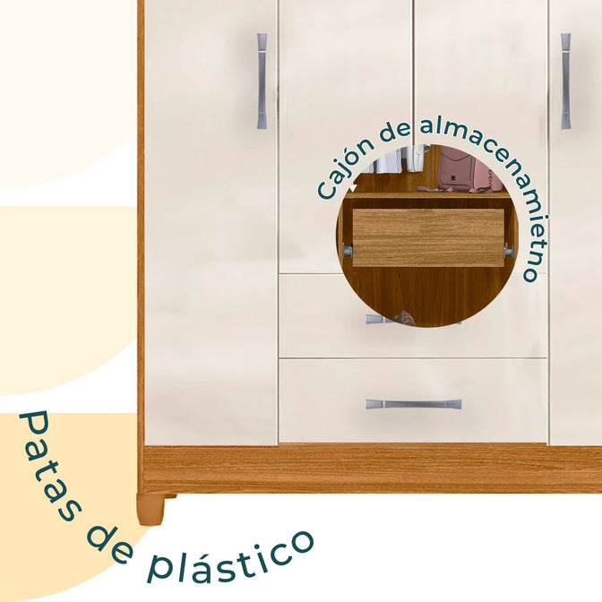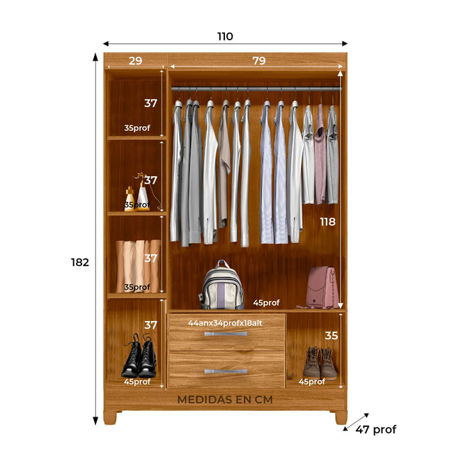 - Amplio espacio de almacenamiento: con repisas, cajones y barra para colgar ropa.