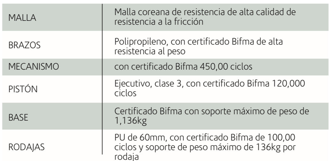 Mecanismo: Ejecutivo (ajuste de altura y bloqueo de reclinamiento)