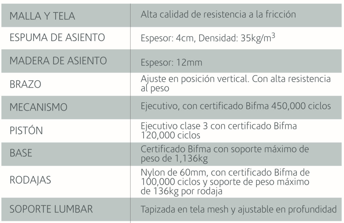- Mecanismo ejecutivo con palanca para ajuste de altura y palanca para permitir el reclina-miento y perilla tensora